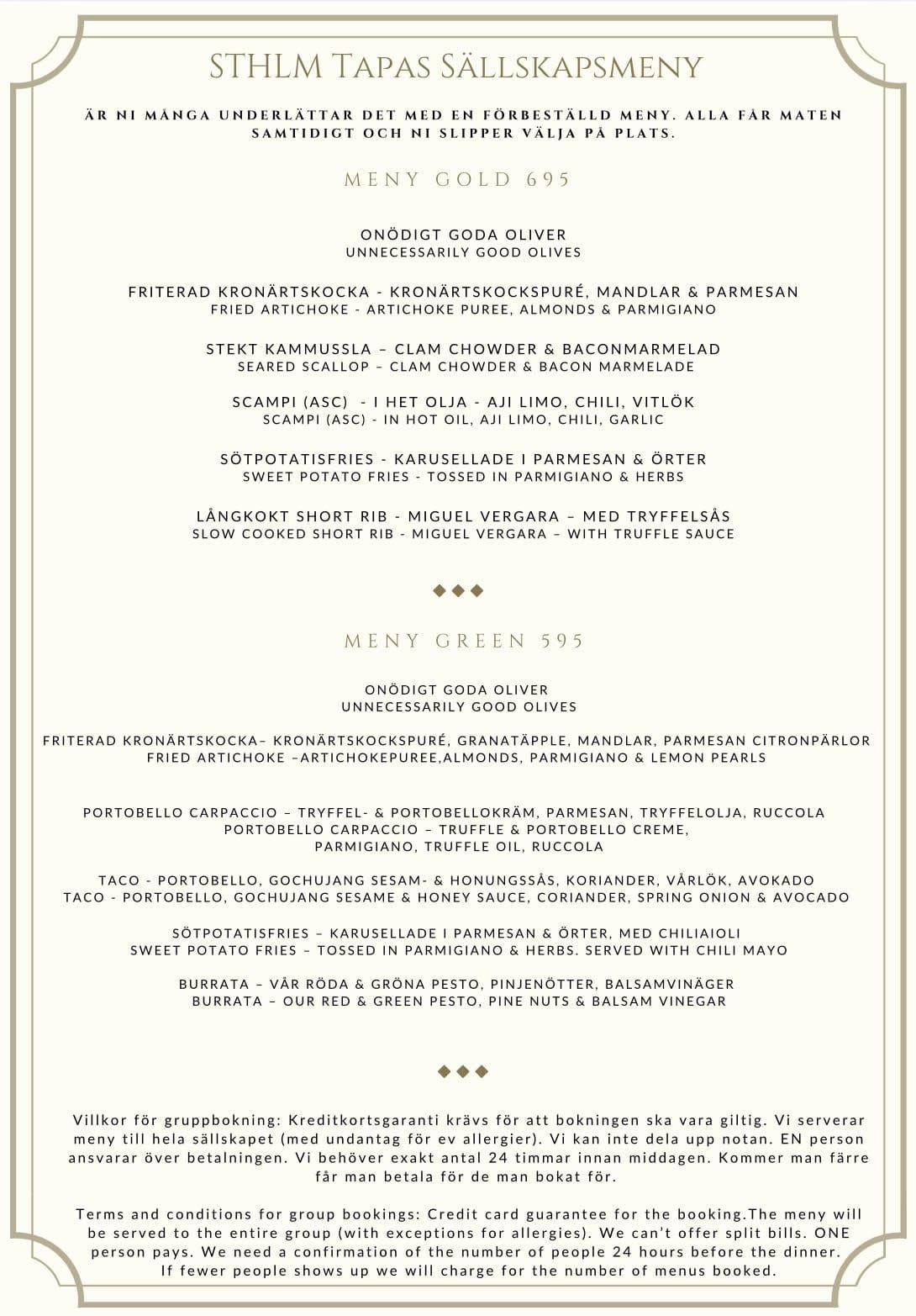 Självklart tar vi hänsyn till allergier, specialkost och dieter, och anpassar menyn efter era behov. Skicka gärna er förfrågan till vasastan@sthlmtapas.se så hjälper vi er vidare.